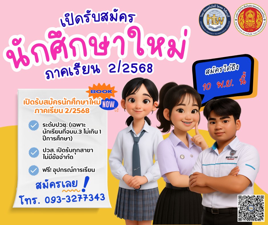 รับสมัครนักเรียน นักศึกษา ระดับ ปวช. และ ปวส. ภาคเรียนที่ 2 ประจำปีการศึกษา 2568 มีสาขาวิชาให้เลือกเรียนตามความสนใจที่เหมาะต่อการประกอบอาชีพในอนาคต